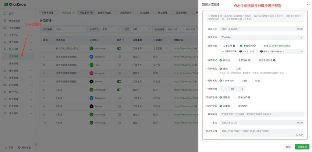 当 WhatsApp 账号数量增加后,如何合理分流粉丝,是很多跨境团队的痛点。ChatKnow 支持生成一条链接绑定多个账号/群组,流量自动均衡分配,进粉更均匀,避免某个号进粉过多导致封号风险。