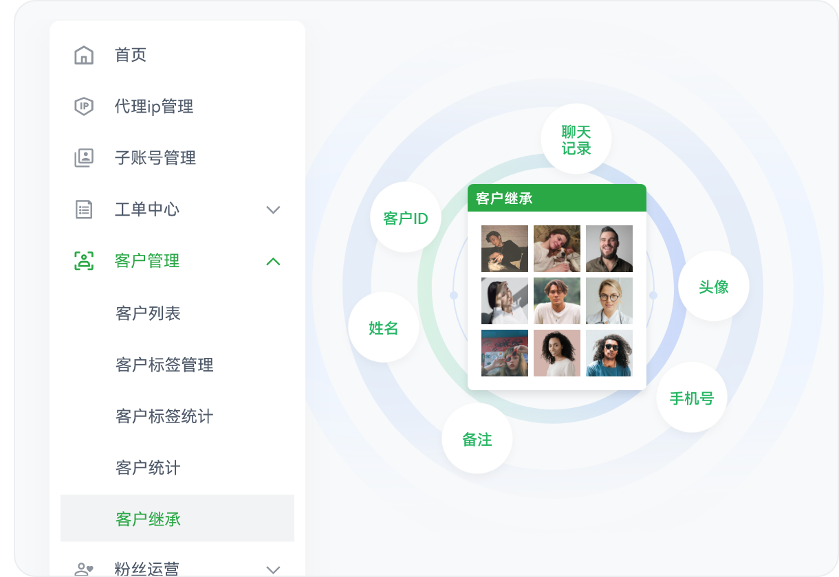 支持多场景客户聊天记录继承,在您因账号被封/员工离职/团队内的资源调配时 均能满足您的诉求,保障您的数据安全,提高客服跟进效率